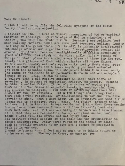 Last week, I led our morning circle which is a brief ritual we do each morning prior to jumping into the day's work. Typically, we have spent it in silence, but some mornings involve stretching or the person who leads reading a poem usually relevant to the day ahead. On one of my days I read my late grandpa’s letter of conscientious objection to the Vietnam War. I had a vague awareness of my grandpa’s past activism, but I had never read the letter myself until a few months ago. Since then, I have been frequently returning to it, like time travel. He wrote this letter when he was my age. Like matter, the chaos that exists now, existed then in a different form through different actors.
