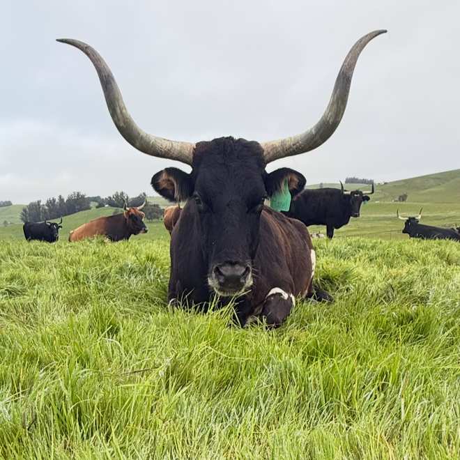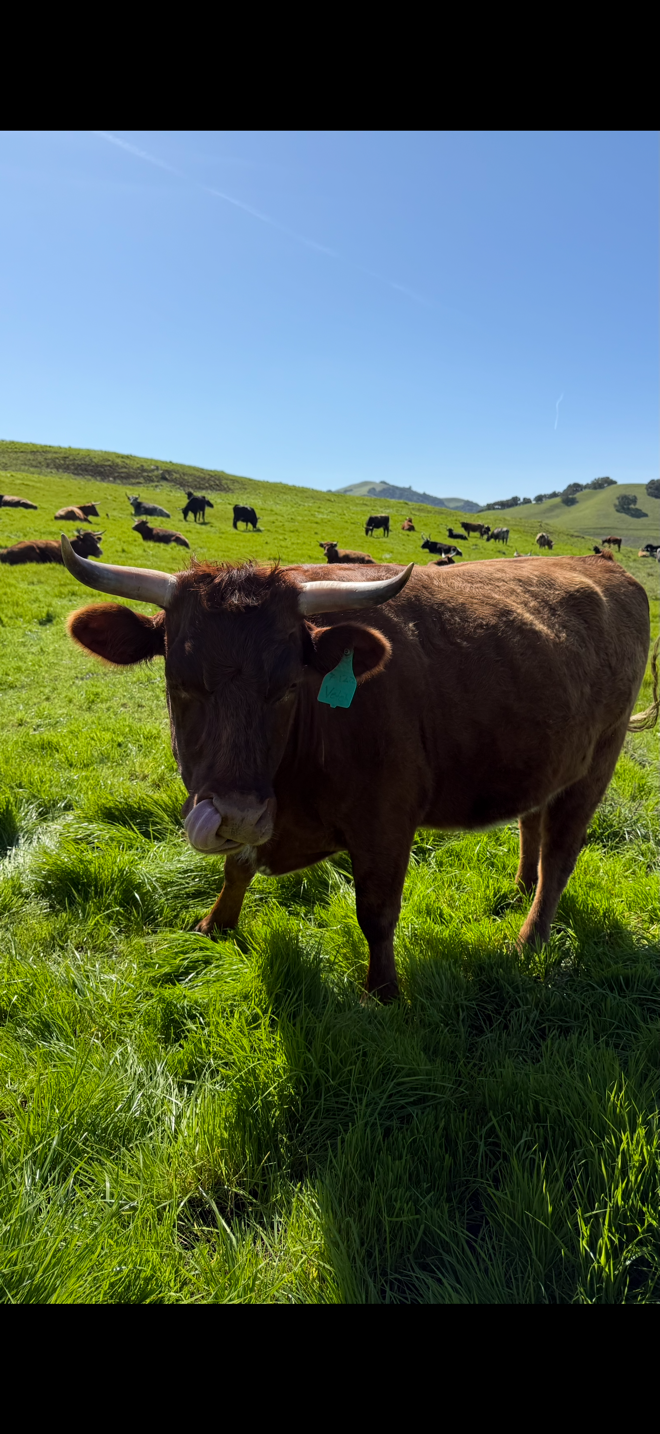 As I was heading out on my bike today to take photos for the blog, I paused and instead of venturing into the vegetable fields, I went to find Danny. I realized that the cows are often missing from the blog and wanted to feature them. Their presence on the farm is important, but they are often in the distance or out of sight from the barnyard. It is rare that anyone but Danny or Jesse interacts with them up close. I know that not only is Danny’s phone full of cow photos, but he has a story for each one. He captures their personalities in the pictures and in his tales. The current jefa of the herd is Dot, featured in the left photo below. She is a commanding cow, tall stature and beautiful horns. Her mother was Daffodil, one of the original cows that we purchased when we first moved to the farm. Now the herd has grown from the original 30 to about 150!