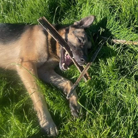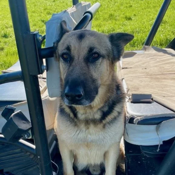 This is Zeke! He is a 3-5 year old rescued German Shepherd. I don't know his whole story but he was abandoned, picked up as a stray in bakersfield, and transferred around several times over a month or two until he landed here. He is a very sweet and mellow guy and has acclimated well. He IS a 75 pound dog, however, and I am mindful of how I engage with his energy, as 75 pounds of rambunctious with teeth is not everyone's speed. He mostly wants to be with me but is happy to say hi and get gentle pets.