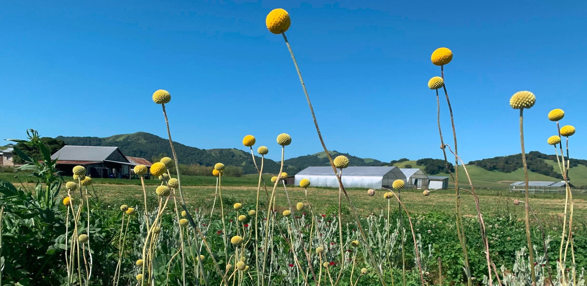 Open Field Farm is situated on a 560-acre rolling grassland ranch just outside of the town of Petaluma on Coast Miwok land. The heart of the farm is the CSA barn, where members come to pick up their share each week. There is a lawn area with a fire pit, play spaces for children, and tables for picnics. The pick-your-own herb garden is there, abuzz with bees and other pollinators. Beyond the CSA barn are the greenhouses and the cut flower gardens available for members to peruse and make bouquets. Further out, there is a balance of flat land in crop production, and hilly grazing land. We currently have about 14 acres dedicated to vegetable fields. As well, there are small stands of eucalyptus, walnuts, and cypress trees; and few notable oaks. We are working on restoring the farm’s drainage waterways with more native tree life. There are several old barns and outbuildings dating from the early 1900s that we are working to renovate one by one. A 10 minute wildflower-studded hike from the CSA barn leads to the pond, our water source for our crops and a great swimming spot in the summer months. This land holds worlds within worlds; one could spend years exploring the various springs and drainage ways, eucalyptus groves, rock outcroppings, blackberry brambles, and more!